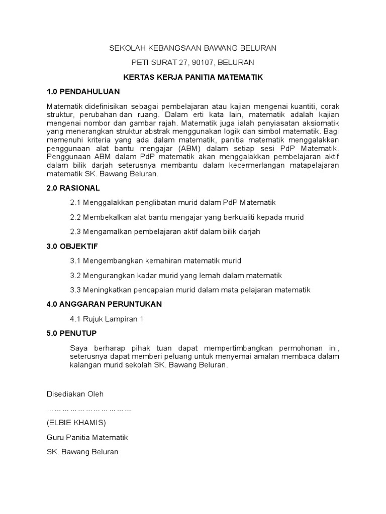 Contoh Kertas Kerja Panitia Matematik